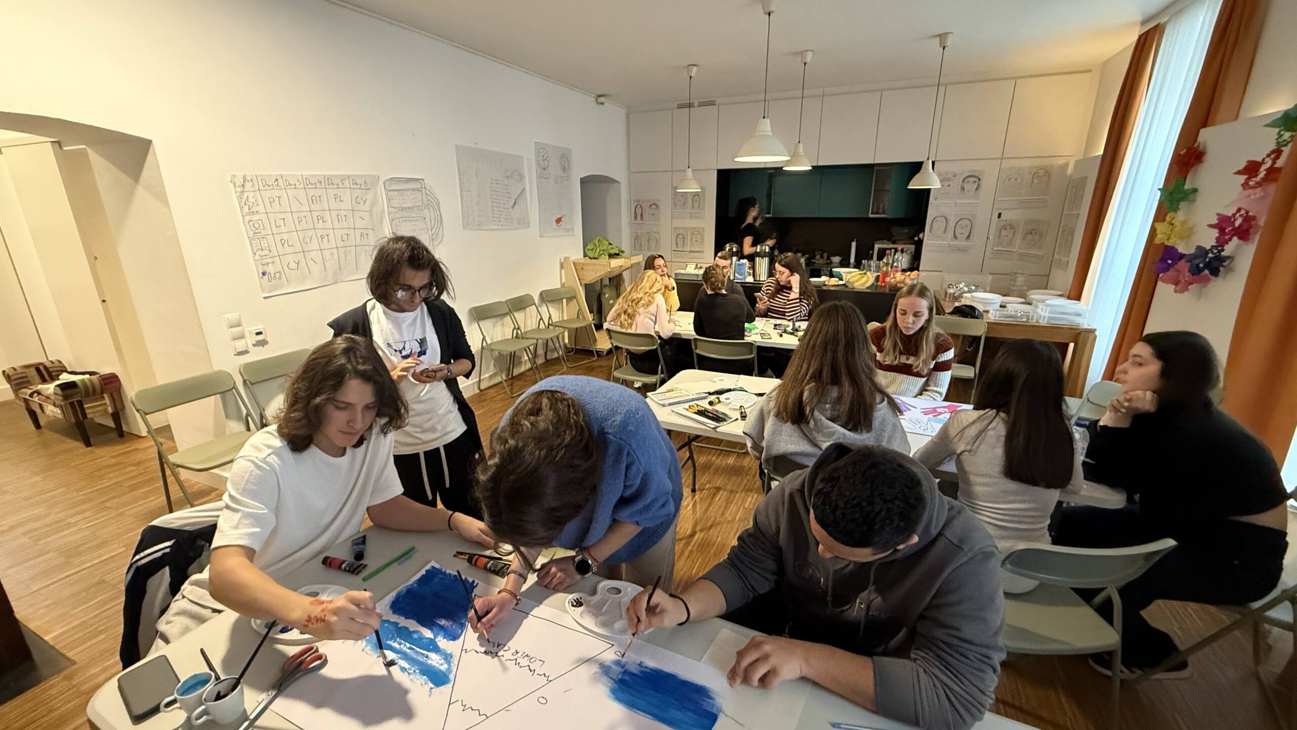 Am Vormittag wurde experimentell-künstlerisch gearbeitet (Materialien, Texturen, freie Komposition). Danach entwickelten Teams „eigene Länder“ mit Regeln – und verteidigten diese in einer UN-Sicherheitsrat-ähnlichen Simulation zu Inklusion und Anti-Diskriminierung.